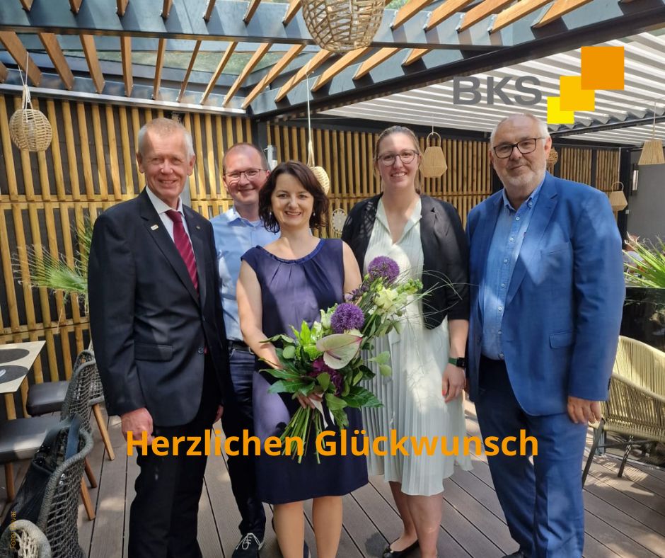 BKS Geschäftsführerin Katharina Bichler reihte sich nicht nur in die Gratulantenschar ein, sondern hatte auch selbst Grund zum Feiern: Am Tag genau 10 Jahre zuvor war sie im selben Haus zur Steuerberaterin ernannt worden. Ein Jubiläum, auf das natürlich auch gleich angestoßen wurde! Herzlichen Glückwunsch!