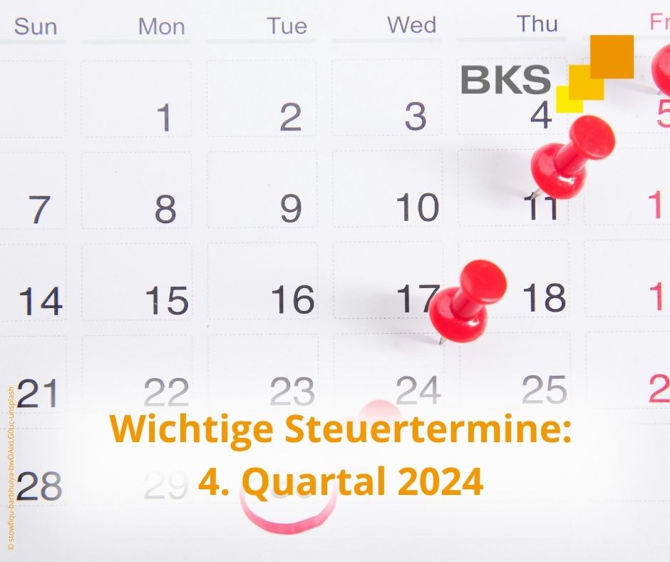 | Fr 15.11.24 | Einkommen- und Körperschaftsteuer-Vorauszahlungen für das 4. Quartal |