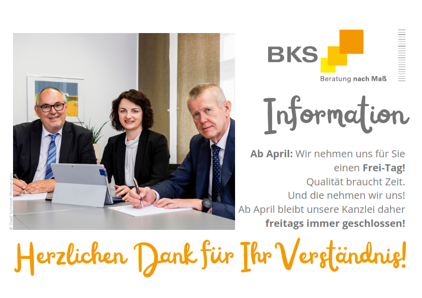 Qualität braucht Zeit. Und die nehmen wir uns! Ab April bleibt unsere Kanzlei daher freitags immer geschlossen! An diesem Tag verzichten wir zwar auf Klientenverkehr, selbstverständlich bleiben aber